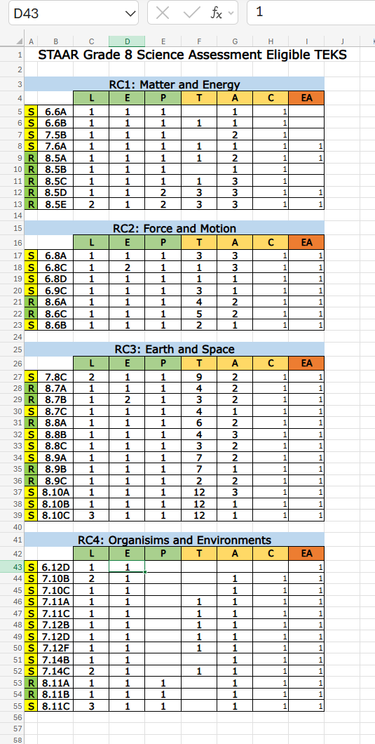 Dual Language Assessment Bank Tracking: Item Distributions and progress toward each was meticulously tracked via Excel during the course of the curriculum and Assessment writing process over the course of three yars.